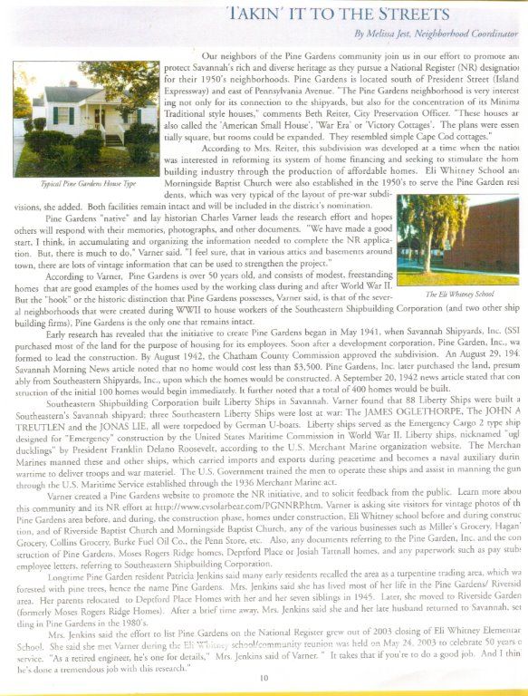 | Pine Gardens Neighborhood National Register Project This site is devoted to all the good people who ever lived in the Pine Gardens Neighborhood in eastern Savannah, GA, and in surrounding neighborhoods. It is further dedicated to the people who owned, managed and worked at the Southeastern Shipbuilding Corporation's Southeastern Shipyard. On November 5, 2014, following years of efforts by numerous current and former Pine Gardens residents, the Pine Gardens Neighborhood, on the basis of, among other things, its being the last remaining neighborhood constructed exclusively to house employees & families at the Southeastern Shipyard during the Liberty Ship campaign in World War II, was listed on the National Resister of Historic Places. Participants will be forever grateful to Professor Daves Rossell of the Savannah College of Art and Design - and some of his students - for their excellent assistance during the campaign. We are likewise thankful to "Savannah Morning News" writers Polly Powers Stramm, Mary Carr Mayle, and Jane Fishman. Additionally, we appreciate capable, enthusiastic help from Ellen Harris and Sarah Ward, both of Chatham County MPC Historic Preservation Department. Also, we appreciate the assistance and resources provided by: The City of Savannah, the Historic Savannah Foundation, the Housing Authority of Savannah, the Georgia Historical Society, and the Bull Street location of the Live Oak Public Libraries. Click the link below to read a November 13, 2014 article in the "Savannah Morning News" on this subject: